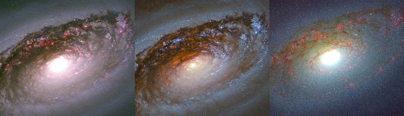 Figure 5: Three-color images of NGC 4826 with Hα in red (left), with Paα in red (right), and a broadband-only view without either (center).